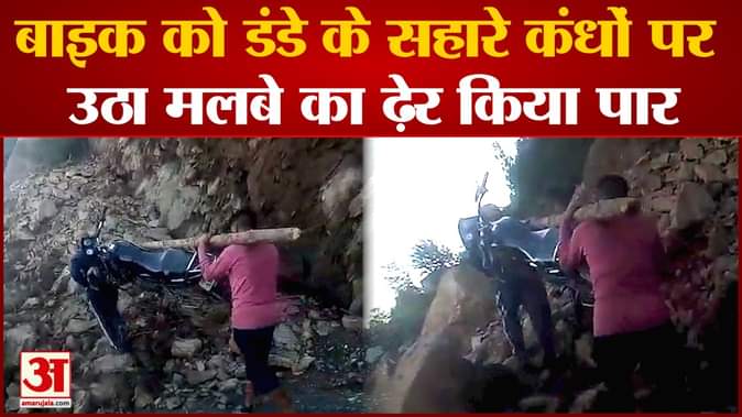 वीडियो: भूस्खलन भी नहीं रोक पाया राह, बाइक को कंधों पर उठाकर चल दिए