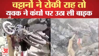 वीडियो: पहाड़ी से सड़क पर गिरी चट्टानों ने रोकी राह तो युवक ने कंधों पर उठा ली बाइक