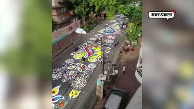 शारदीय नवरात्र की शुरुआत के साथ ही बंगाल में दुर्गा पूजा की धूम देखने को मिली। जहां कोलकाता में सड़क पर बनी डेढ़ किलोमीटर लंबी रंगोली सबके आकर्षण का केंद्र बनी हुई है। ये दावा किया जा रहा है कि ये देश की सबसे लंबी रंगोली है।