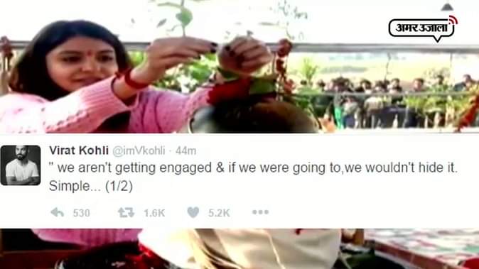 पिछले कई दिनों से मीडिया में चल रही सगाई की संभावना की खबरों के बीच विराट कोहली का ट्वीट आया है जिसमें लिखा है कि इन खबरों में बिल्कुल भी सच्चाई नहीं है । कोहली ने इस खबर का खंडन किया है कि वो और अनुष्का सगाई करने नहीं जा रहे हैं । विराट ने एक ट्वीट कर ये कहा कि अगर वो सगाई करते हैं तो हम इस बात को नहीं छिपाएंगे । गौरतलब है कि गुरुवार को ज्यादातर न्यूज वेबसाइट्स और चैनलों पर यह खबर चल रही थी कि टीम इंडिया के टेस्ट कप्तान विराट कोहली और अभिनेत्री अनुष्का शर्मा नए साल के मौके पर सगाई करने जा रहे हैं ।