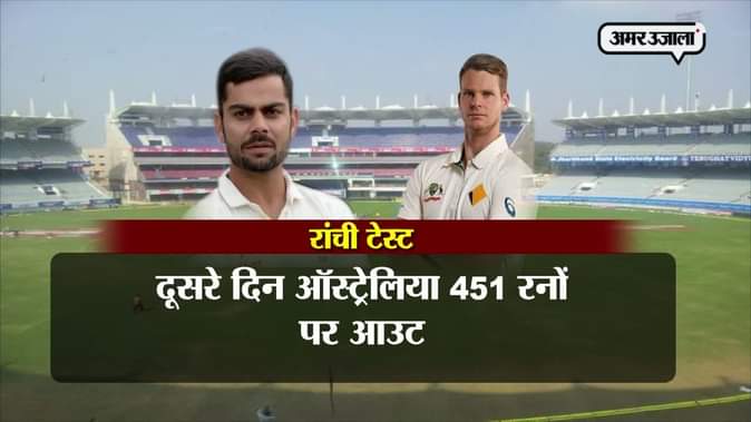 रांची टेस्ट मैच का दूसरा दिन बराबरी पर खत्म हुआ। पहले दिन बनाए 299 रनों के आगे खेलने उतरी ऑस्ट्रेलिया की शुरूआत धीमी रही और ऑस्ट्रेलिया 451 रनों पर ऑल आउट हो गई। पहले दिन 82 रनों पर नाबाद रहे ग्लेन मैक्सवेल शतक बनाकर 106 रनों पर आउट हुए वहीं कप्तान स्टीव स्मिथ 178 रनों पर नाबाद लौटे। भारत कि ओर से रविंद्र जड़ेजा ने पांच विकेट झटके। स्टंप्स तक भारतीय टीम का स्कोर एक विकेट खोकर 120 रन रहा। भारत की ओर से लोकेश राहुल ने सबसे ज्यादा 61 रन बनाए।