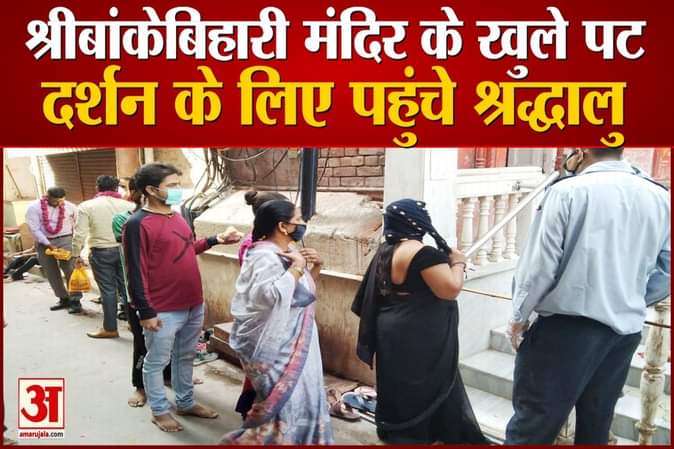 कोरोना कर्फ्यू के चलते करीब एक माह से बंद ठाकुर श्रीबांकेबिहारी के पट मंगलवार से खुल गए। पहले दिन भक्तों ने अपने आराध्य के दर्शन किए। हालांकि प्रदेश सरकार की नई गाइडलाइन के बाद मंदिर प्रबंधन ने भक्तों के लिए ठाकुरजी के द्वार शनिवार और रविवार को बंद रखने का फैसला लिया है। पहले दिन श्रीबांकेबिहारी मंदिर में आने वाले श्रद्धालुओं की थर्मल स्क्रीनिंग की गई। मास्क के बिना प्रवेश नहीं दिया गया। मंदिर परिसर में कोविड गाइड लाइन के तहत प्रवेश दिया गया।