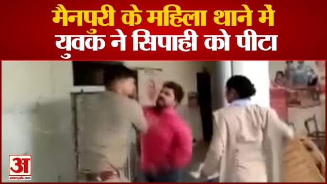 मैनपुरी के महिला थाने में एक युवक ने सिपाही से भिड़ गया। कहासुनी के दौरान उसने सिपाही पर हाथ उठा दिया। बीच-बचाव करने आई महिला सिपाही को भी धक्का दे दिया। थाने में सिपाही और युवक के बीच जमकर लात-घूंसे चले। मारपीट का वीडियो किसी ने बना लिया। यह मंगलवार को वायरल हो गया। घटना सोमवार की है। आरोपी युवक विष्णु है। वह फर्रुखाबाद जिले का रहने वाला है। उस पर पत्नी को प्रताड़ित करने, दहेज मांगने का आरोप है। पुलिस ने आरोपी को गिरफ्तार कर लिया है। उसके खिलाफ मुकदमा दर्ज किया गया है।