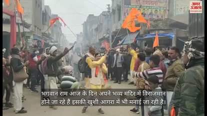 अयोध्या में चल रहे प्राण प्रतिष्ठा महोत्सव को लेकर आगरा के फतेहाबाद कस्बे में दिवाली जैसा दृश्य नजर आया। बीच सड़क पर आतिशबाजी की गई। प्रभु श्रीराम के नाम की गूंज के साथ भगवा ध्वज लहराया।