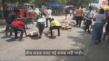 VIDEO : बीच सड़क पलट गई शराब लदी गाड़ी, पुरुषों के साथ महिलाओं ने भी जमकर लूटी शीशियां