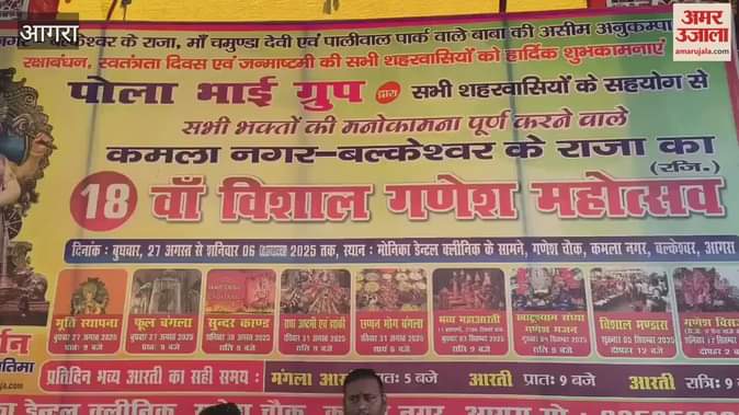 आगरा में कमला नगर, बलकेश्वर के राजा का 18वां विशाल गणेश महोत्सव बुधवार को कमला नगर के गणेश चौक पर शुरू होगा। गणेश चतुर्थी के उपलक्ष्य में पोला भाई ग्रुप की ओर से इसका आयोजन किया जाएगा। जिसमें शहर की सबसे बड़ी 25 फुट ऊंची व 6700 किलोग्राम वजन की गणेश प्रतिमा की स्थापना होगी। इसके लिए सोमवार को पोला भाई ग्रुप की ओर से महोत्सव के पोस्टर विमोचन किया गया। जिसमें बताया कि गणेश जी की यह प्रतिमा पर्यावरण के अनुकूल है और कोलकाता व नासिक के कारीगर इस प्रतिमा का निर्माण कर रहे हैं। महोत्सव के दौरान कई सांस्कृतिक और धार्मिक कार्यक्रमों का भी आयोजन होगा।