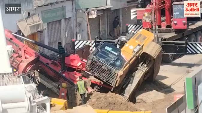 VIDEO: आगरा मेट्रो के निर्माण कार्य के दौरान हुआ हादसा, शराब के ठेके पर गिरी क्रेन; हटाई जा रही मशीन