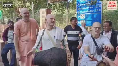 आगरा में ताजमहल पर रविवार को एक अलग ही दृश्य देखने को मिला। वृंदावन के आनंद धाम गौडिया आश्रम से ताजमहल घूमने पहुंचे न्यूजीलैंड के पर्यटकों ने घंटों ताजमहल के गेट पर हरे कृष्णा हरे रामा भजन गाकर नृत्य किया। इन्हें देखने वालों की भीड़ लग गई। देशी-विदेशी सभी पर्यटकों ने उनकी वीडियो भी बनाई।