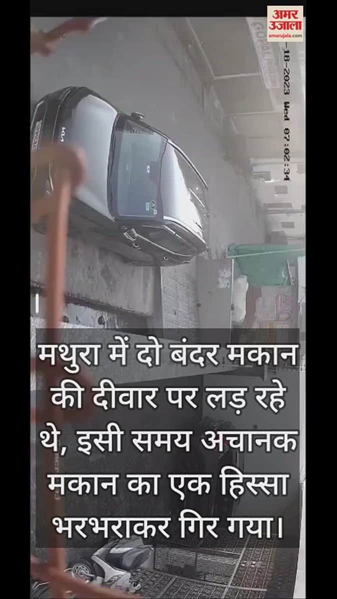 VIDEO : मथुरा में जर्जर मकान की दीवार पर लड़ रहे थे बंदर, अचानक भरभराकर गिरा; बच्ची सहित चार लोग घायल