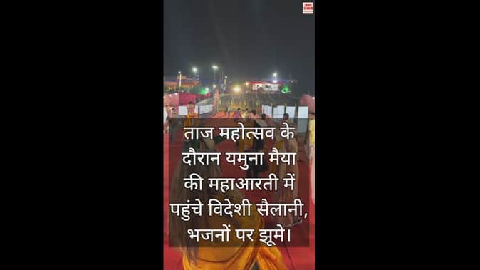 VIDEO : ताज महोत्सव के दौरान यमुना मैया की महाआरती में पहुंचे विदेशी सैलानी, भजनों पर झूमे