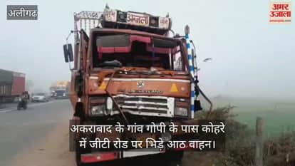 अकराबाद के गांव गोपी के पास कोहरे में जीटी रोड पर भिड़े आठ वाहन