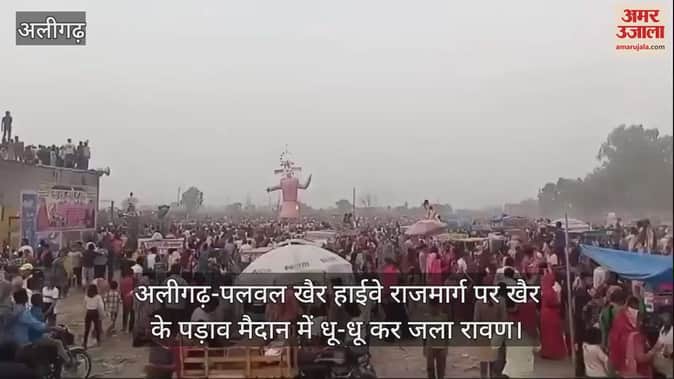 VIDEO : अलीगढ़-पलवल खैर हाईवे राजमार्ग पर खैर के पड़ाव मैदान में धू-धू कर जला रावण