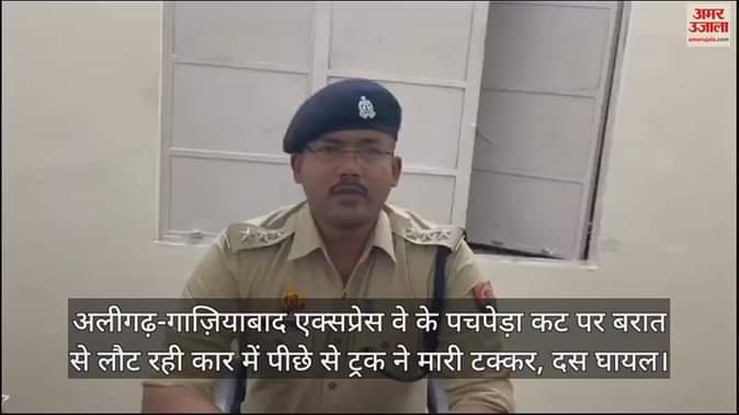 VIDEO : अलीगढ़-गाज़ियाबाद एक्सप्रेस वे के पचपेड़ा कट पर बरात से लौट रही कार में पीछे से ट्रक ने मारी टक्कर, दस घायल
