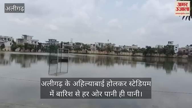 अलीगढ़ के अहिल्याबाई होलकर स्टेडियम में बारिश से हर ओर पानी ही पानी