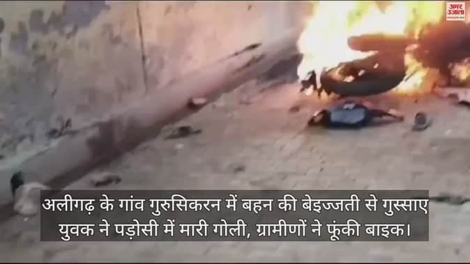 VIDEO : अलीगढ़ के गांव गुरुसिकरन में बहन की बेइज्जती से गुस्साए युवक ने पड़ोसी में मारी गोली, ग्रामीणों ने फूंकी बाइक