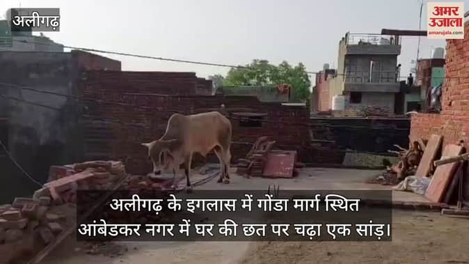अलीगढ़ के इगलास में गोंडा मार्ग स्थित आंबेडकर नगर में घर की छत पर चढ़ा एक सांड़