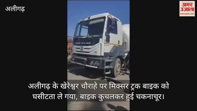 VIDEO : अलीगढ़ के खेरेश्वर चौराहे पर मिक्सर ट्रक बाइक को घसीटता ले गया, बाइक कुचलकर हुई चकनाचूर