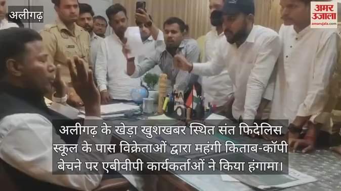 VIDEO : अलीगढ़ के खेड़ा खुशखबर स्थित संत फिदेलिस स्कूल के पास विक्रेताओं द्वारा महंगी किताब-कॉपी बेचने पर एबीवीपी कार्यकर्ताओं ने किया हंगामा