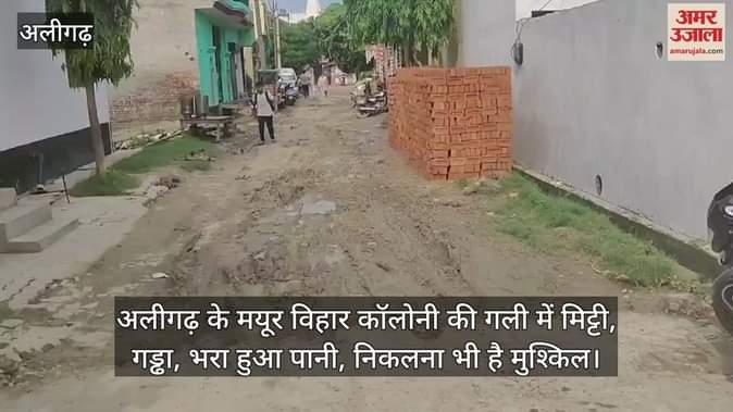 अलीगढ़ के मयूर विहार कॉलोनी की गली में मिट्टी, गड्ढा, भरा हुआ पानी, निकलना भी है मुश्किल