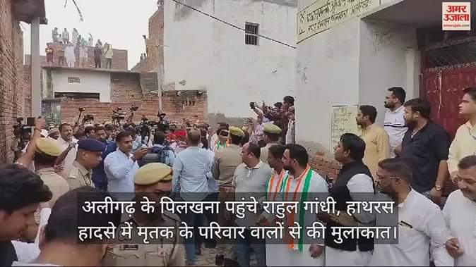 VIDEO : अलीगढ़ के पिलखना पहुंचे राहुल गांधी, हाथरस हादसे में मृतक के परिवार वालों से की मुलाकात