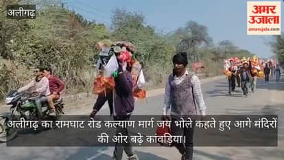 अलीगढ़ का रामघाट रोड कल्याण मार्ग जय भोले कहते हुए आगे मंदिरों की ओर बढ़े कांवड़िया