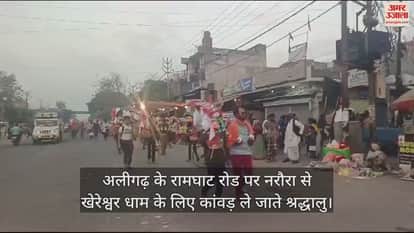 VIDEO : अलीगढ़ के रामघाट रोड पर नरौरा से खेरेश्वर धाम के लिए कांवड़ ले जाते श्रद्धालु