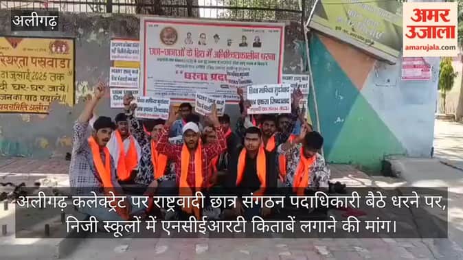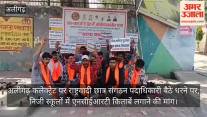 निजी स्कूलों में एनसीईआरटी किताबें न लगाने पर अलीगढ़ कलेक्ट्रेट पर राष्ट्रवादी छात्र संगठन पदाधिकारी धरने पर बैठै। कलेक्टर के बाहर राष्ट्रवादी छात्र संगठन पदाधिकारियों ने एनसीईआरटी का कोर्स लागू कराने को लेकर विरोध जताया।