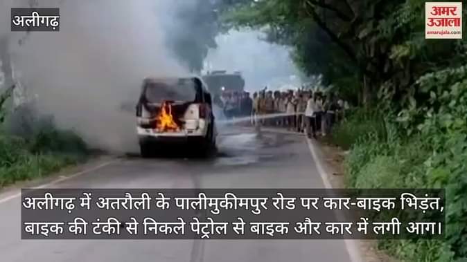 अलीगढ़ में अतरौली के पालीमुकीमपुर रोड पर कार-बाइक भिड़ंत, बाइक की टंकी से निकले पेट्रोल से बाइक और कार में लगी आग
