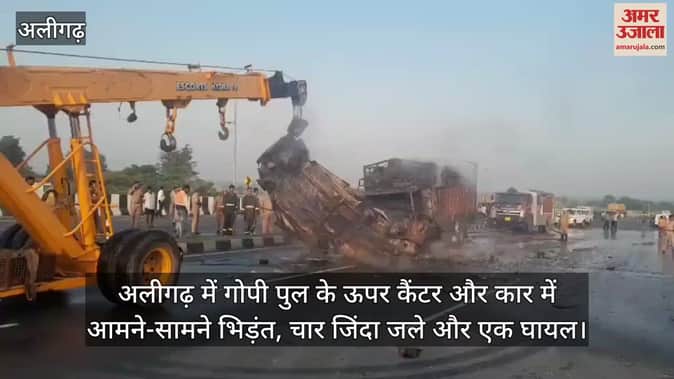 अलीगढ़ में गोपी पुल के ऊपर कैंटर और कार में आमने-सामने भिड़ंत, चार जिंदा जले और एक घायल