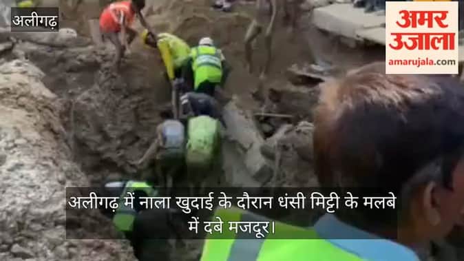 अलीगढ़ में नाला खुदाई के दौरान धंसी मिट्टी के मलबे में दबे मजदूर