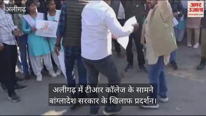 VIDEO : अलीगढ़ में टीआर कॉलेज के सामने बांग्लादेश सरकार के खिलाफ प्रदर्शन