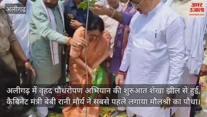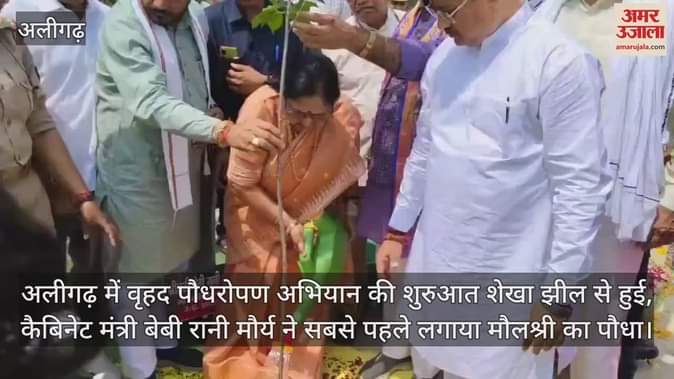 अलीगढ़ जिले में वृहद पौधरोपण अभियान की शुरुआत 9 जुलाई सुबह शेखा झील पक्षी विहार से हुई। मुख्य अतिथि प्रदेश की कैबिनेट मंत्री बेबी रानी मौर्य ने सबसे पहले मौलश्री का पौधा लगाया। कहा कि सफल पौधरोपण भाषण से नहीं हो सकता, अपनी मां-दादी के नाम से भावनात्मक रूप से पौधा लगाएं, तभी आप उसकी देखभाल कर सकेंगे। इसी भावना के साथ बेटी के नाम पर पौधा लगाएं।