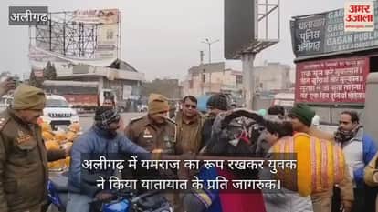 अलीगढ़ में यमराज का रूप रखकर युवक ने किया यातायात के प्रति जागरुक