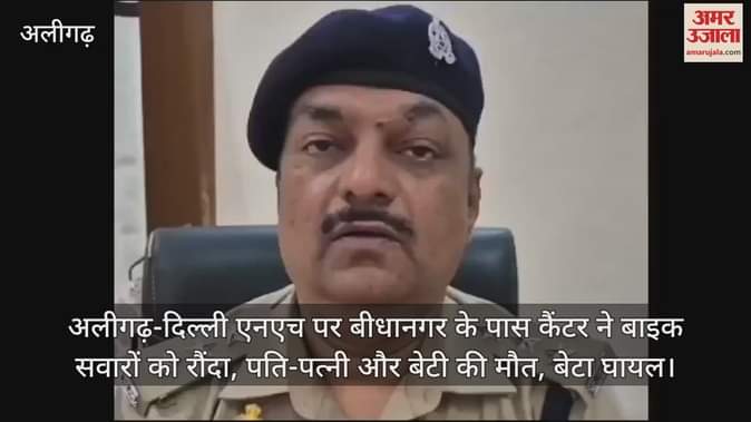 VIDEO : अलीगढ़-दिल्ली एनएच पर बीधानगर के पास कैंटर ने बाइक सवारों को रौंदा, पति-पत्नी और बेटी की मौत, बेटा घायल