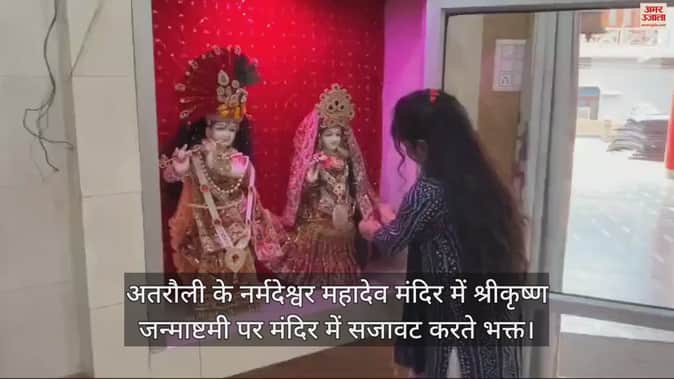 VIDEO : अतरौली के नर्मदेश्वर महादेव मंदिर में श्रीकृष्ण जन्माष्टमी पर मंदिर में सजावट करते भक्त