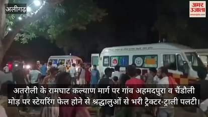 अतरौली के रामघाट कल्याण मार्ग पर गांव अहमदपुरा व चैंडौली मोड़ के निकट 9 जुलाई रात करीब 9.30 बजे स्टेयरिंग फेल होने के कारण श्रद्धालुओं से भरी ट्रैक्टर-ट्राली पलट गई। इसमें करीब 12 श्रद्धालु गंभीर रूप से घायल हो गए। उन्हें उपचार के लिए दीन दयाल अस्पताल में भर्ती कराया गया है।