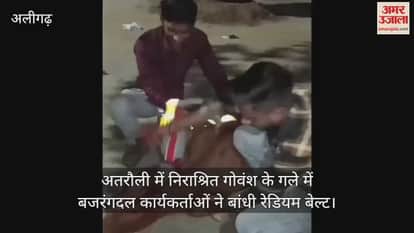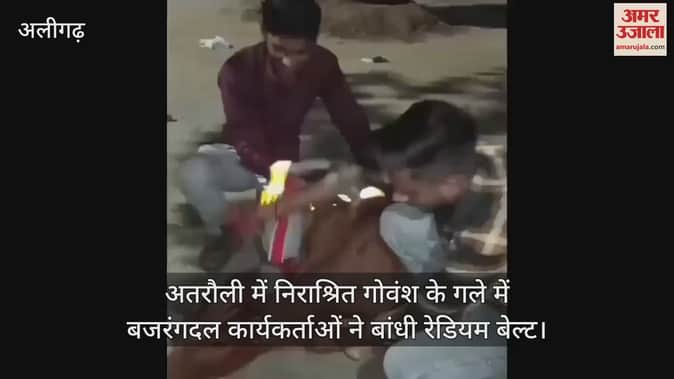 VIDEO : अतरौली में निराश्रित गोवंश के गले में बजरंगदल कार्यकर्ताओं ने बांधी रेडियम बेल्ट