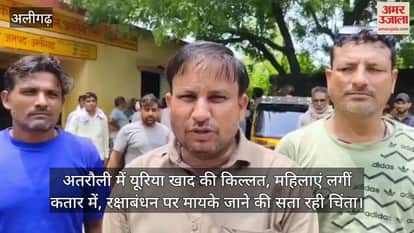 अलीगढ़ के अतरौली में यूरिया खाद की किल्लत कम होने का नाम नहीं ले रही। महिलाओं को रक्षाबंधन पर मायके जाने की फिक्र है, लेकिन खाद की चिंता में वह कतार में लगी हैं। क्षेत्रीय सहकारी समिति पर 8 अगस्त सुबह से कतार में बैठी महिलाओं ने जब दोपहर 12.30 बजे तक खाद का वितरण नहीं हुआ तो हंगामा किया। महिलाओं ने कहा कि उन्हें राखी बांधने मायके भी जाना है लेकिन खाद की चिंता पहले है। खाद नहीं मिल पा रहा।