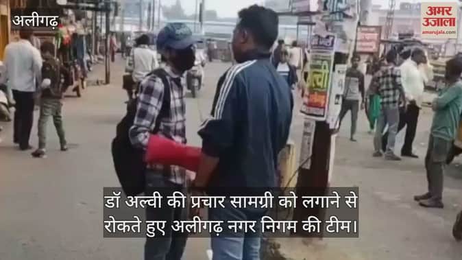 डॉ अल्वी की प्रचार सामग्री को लगाने से रोकते हुए अलीगढ़ नगर निगम की टीम