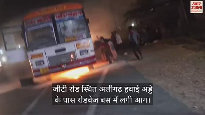 VIDEO : जीटी रोड स्थित अलीगढ़ हवाई अड्डे के पास रोडवेज बस में लगी आग