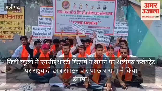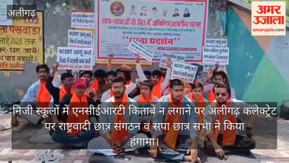 निजी स्कूलों में एनसीईआरटी किताबें न लगाने पर अलीगढ़ कलेक्ट्रेट पर राष्ट्रवादी छात्र संगठन व सपा छात्र सभा ने जमकर हंगामा किया। कलेक्टर के बाहर राष्ट्रवादी छात्र संगठन पदाधिकारियों ने एनसीईआरटी का कोर्स लागू कराने को लेकर धरना- प्रदर्शन और नारेबाजी की। साथ ही सपा छात्र सभा ने भी विरोध जताया। सभा के मोहसिन मेवाती से पुतला छीनने को लेकर पुलिसकर्मियों की नोक-झोंक भी हुई।