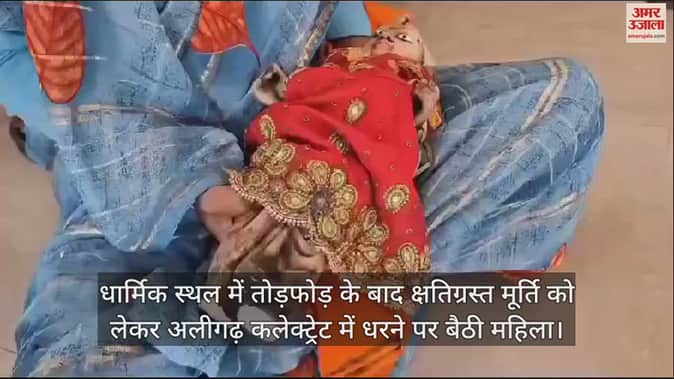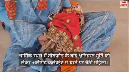 VIDEO : धार्मिक स्थल में तोड़फोड़ के बाद क्षतिग्रस्त मूर्ति को लेकर अलीगढ़ कलेक्ट्रेट में धरने पर बैठी महिला