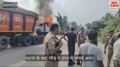 VIDEO : हादसे के बाद बेकाबू हुई भीड़, डंपर को लगाई आग, फायर ब्रिगेड को आग बुझाने से रोका