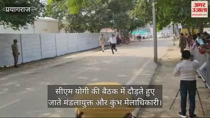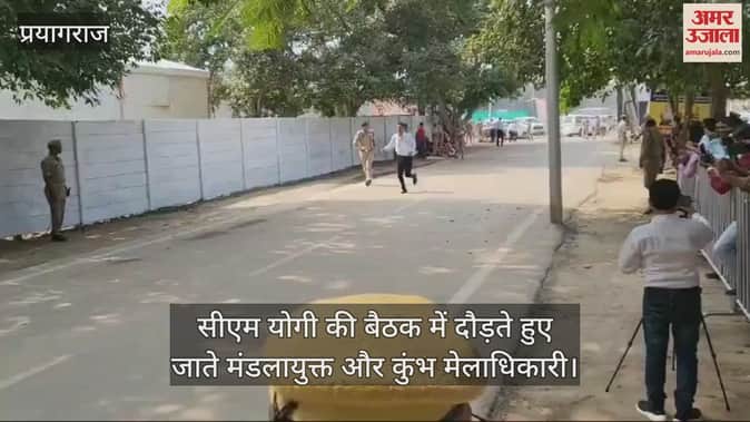 मुख्यमंत्री योगी आदित्यनाथ ने रविवार को प्रयागराज पहुंचकर महाकुंभ की तैयाारियों का जायजा लिया और लंबित कार्यों की समीक्षा की। निरीक्षण के बाद उन्होंने आईट्रिपलसी में अधिकारियों के साथ बैठक की। एआईसीसीसी के सभागार में बैठक में हिस्सा लेने के लिए प्रयागराज के मंडलायुक्त विजय विश्वास पंत और कुंभ मेलाधिकारी विजय किरन आनंद दौड़ते हुए पहुंचे। उनके पीछे उनके अर्दली, अंगरक्षक और स्टाफ के लोग भी दौड़ते हुए दिख रहे हैं। यह फोटो तेजी से वायरल हो रहा है।