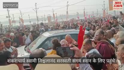 Prayagraj Magh Mela - पुरी पीठाधीश्वर शंकराचार्य स्वामी निश्चलानंद सरस्वती संगम स्नान के लिए पहुंचे। बड़ी संख्या में शिष्यों और साधु संतों के साथ वह संगम नोज तक कार से आए। इसके बाद शिष्य उन्हें व्हील चेयर पर बैठाकर संगम तक ले गए। घंटा घड़ियाल की गूंज और गंगा मैया के जयकारों के बीच उन्होंने डुबकी लगाई।