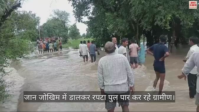 VIDEO : जान जोखिम में पानी के तेज बहाव के बीच रपटा पुल पार कर रहे ग्रामीण, हादसे की आशंका