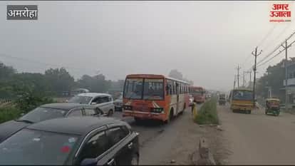 VIDEO : गजराैला में ई-रिक्शा बचाने के लिए डिवाइडर पर चढ़ाया ट्रेलर, हाईवे पर लग गया जाम