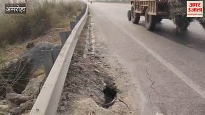 गजरौला हाईवे पर मुरादाबाद से दिल्ली जाने वाले वाहनों की लेन पर बना गड्ढा हादसे का कारण हो सकता है। गड्ढे के बराबर काफी दूर तक दरार पड़ गई है। कोई भारी वाहन उसके पास आने पर हाईवे धंस सकता है।
