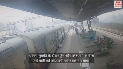 VIDEO : ट्रेन और प्लेटफार्म के बीच फंसा यात्री, जीआरपी के कांस्टेबल ने ऐसे बचाया