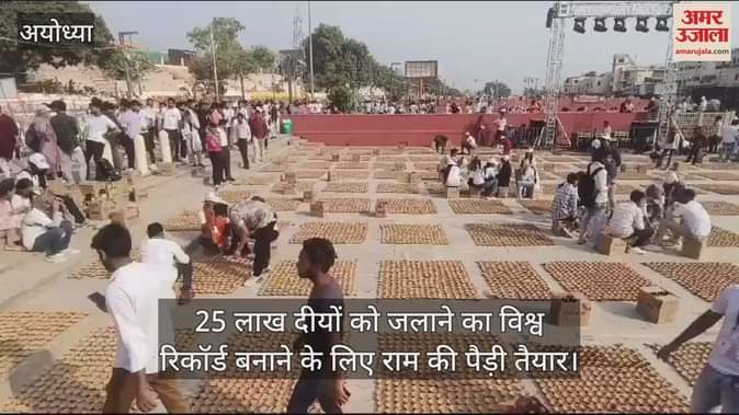रामनगरी में 500 वर्षों बाद बालक राम के भव्य मंदिर में विराजने के बाद से अयोध्यावासी खुशी से सराबोर हैं। नव्य मंदिर में उनकी पहली दिवाली पर 25 लाख दीपों के एक साथ जलने का कीर्तिमान बनेगा। 25 लाख दीयों को जलाने का विश्व रिकॉर्ड बनाने के लिए राम की पैड़ी तैयार है। राम की पैड़ी में सजाए गए दीयों में तेल और बाती डालने का काम अंतिम दौर में है। 30 हजार स्वयंसेवकों की टीम इस काम पर जुटी हुई है।